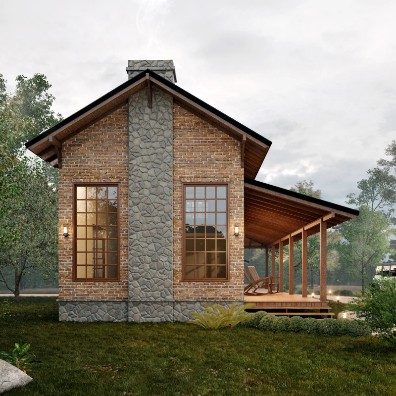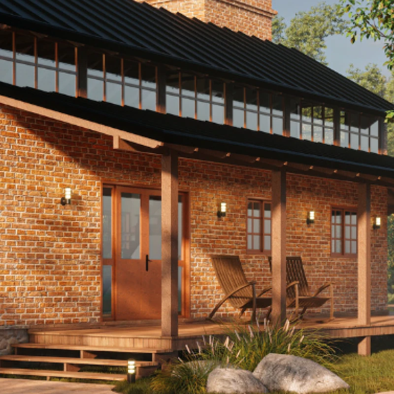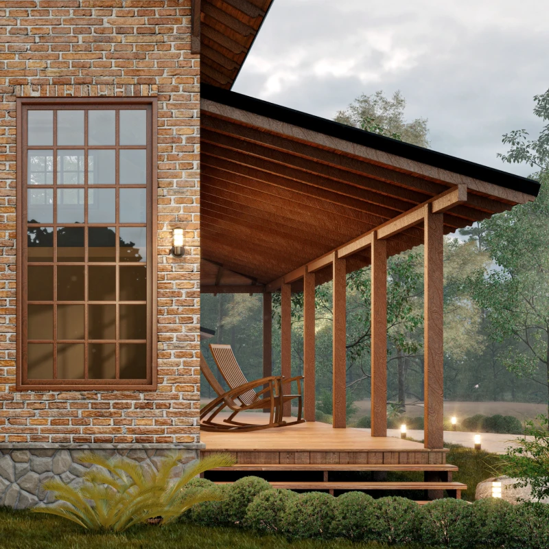 O alpendre em L recebe o calor do pôr do sol, ambiente perfeito para tomar um cafezinho ou chimarrão.